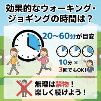 1回のウォーキング・ジョギングはどれくらい続ければ?ウォーキングやジョギングをするときに、大体どれくらいの時間続ければいいですか?これはウォーキング…