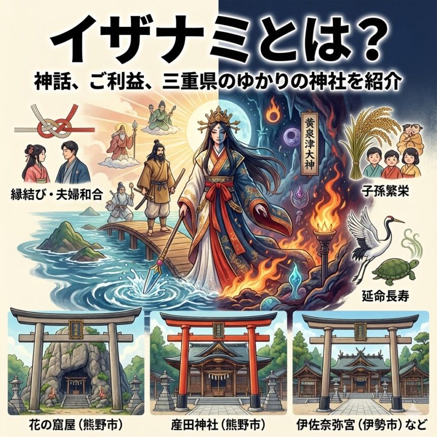 イザナミはイザナミは火の神様・カグツチを出産した際に、大やけどして亡くなる前にも、吐しゃ物や排せつ物などから様々な神様を生み出し、死後の世界に行ったことから、死の世界=黄泉津大神(よもつおおかみ)と呼ばれています。