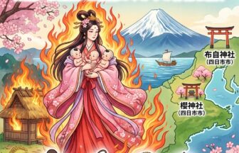 花の窟屋(はなのいわや)は日本最古の神社と言われ、世界遺産の一つに登録されている神社で、母神・イザナミとともに祀られています。