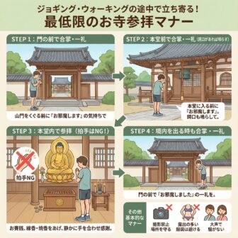 ジョギングやウォーキングをしている際に、ふとお寺に立ち寄りたくなる時はありませんか?そんなとき、せっかくお寺で参拝するなら、最低限のマナーだけでも…