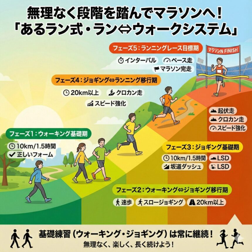 ランシスではウォーキングからマラソンレースを走るまでのステップとして、大まかに5つのフェーズに分け、無理なく徐々に負荷を増やしていきながら、走力アップにつなげていきます。