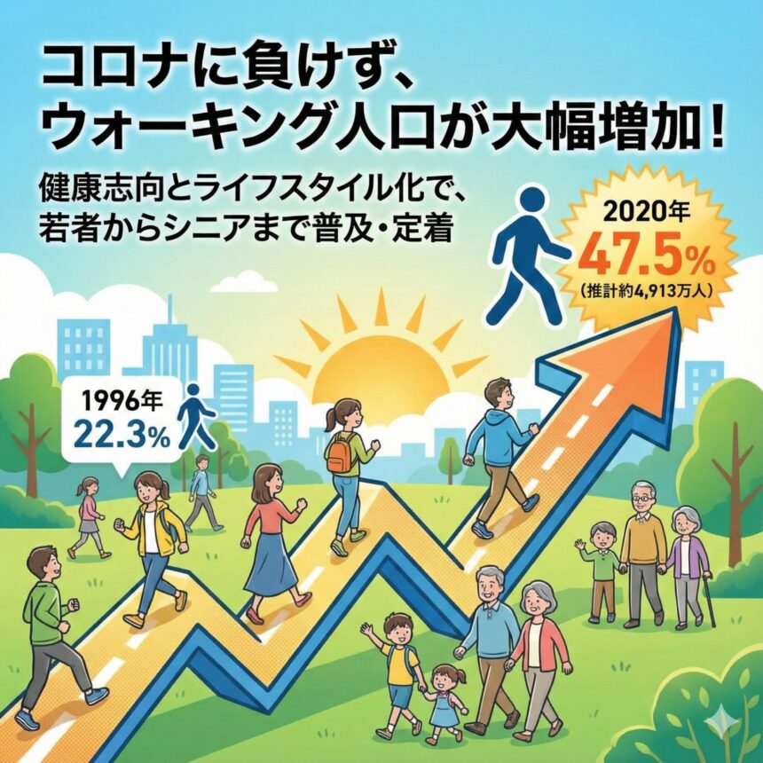 ちなみに調査が開始された1996年の調査では散歩・ウォーキング実施率(年1回)22.3%だったという事で、ウォーキング実施率は1996年から2020年の間に倍増したという事になります。